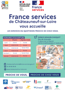 Le Bus France Services ne peut en ce moment plus se rendre à l'Atelier le jeudi matin en raison d'un problème technique. Cependant, si vous avez des démarches importantes à effectuer, vous pouvez vous rendre à Châteauneuf-sur-Loire, au rez-de-chaussée de l'Espace Kohler-Choquet, 2 place de la Liberté.