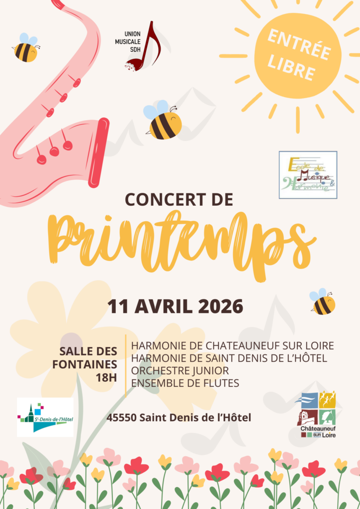 Le samedi 11 avril 2026, à partir de 18h, l’École de Musique s'unira avec des associations musicales de Saint-Denis-de-l'Hôtel et de Châteauneuf-sur-Loire.